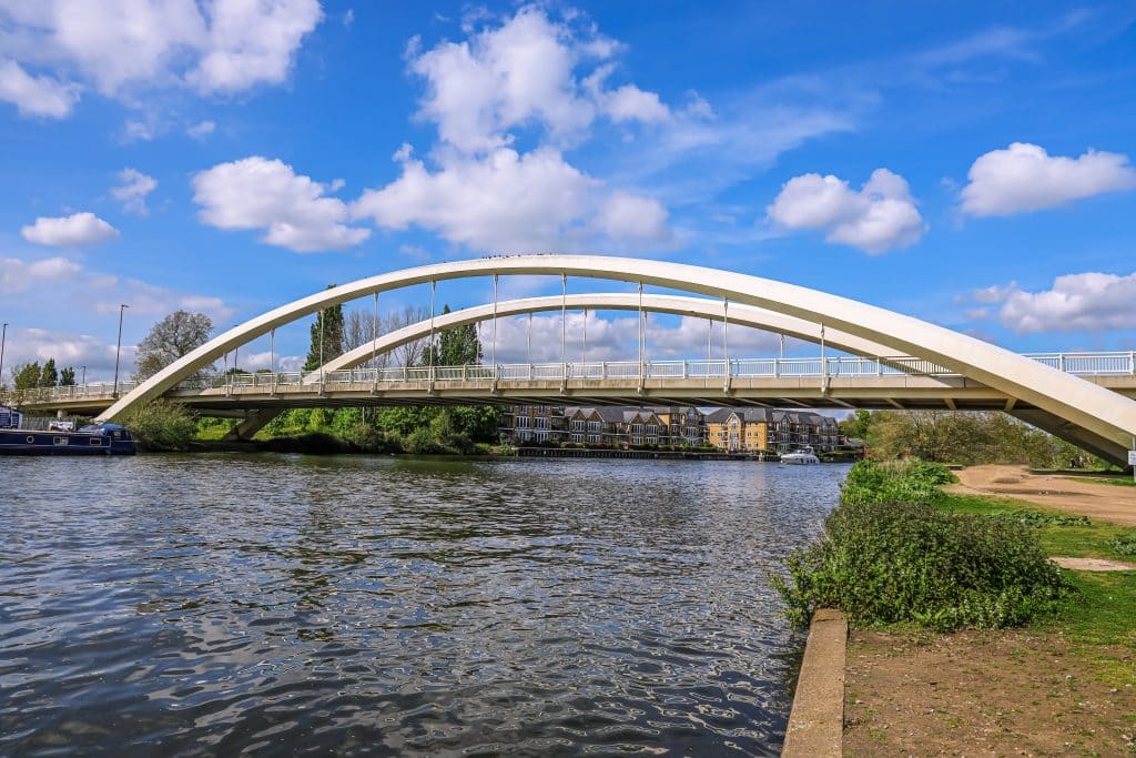 The village of Shepperton emerges, with its range of small eateries and independent shops. Down Green Lane, the bus makes its way and before long the grandiose dynamic looking white expanse of Walton bridge, with stunning views down the river and of boats moored at Walton Marina as well as the tranquil sweep of the Thames curving at Cowey Sale.